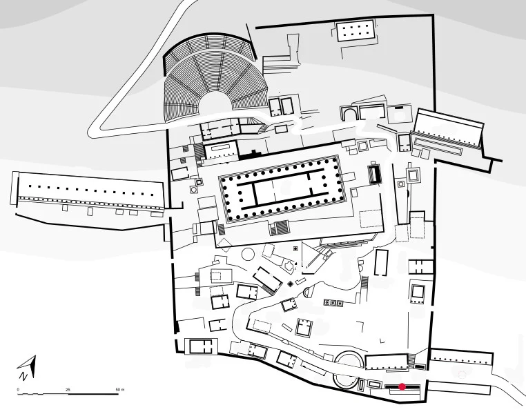 The votive offering was placed in the most publicly visible place of the sanctuary close to the entrance, so it would be situated in front of the Athenian’s monument commemorating their victory in Marathon. The Athenian’s monument was set a little more to the west and had been there for years.